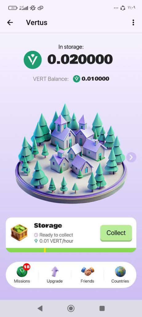 در قسمت بالا بخش in storage مقدار VERT در حال استخراج را به شما نشان می دهد و در قسمت VERT Balance مقدار VERT موجودی شما را نشان می دهد. و در قسمت میانی دهکده ای را مشاهده می کنید که می توانید شکل آن را تغییر دهید که در بخش های بعدی نحوه این کار را برایتان توصیح می دهیم.