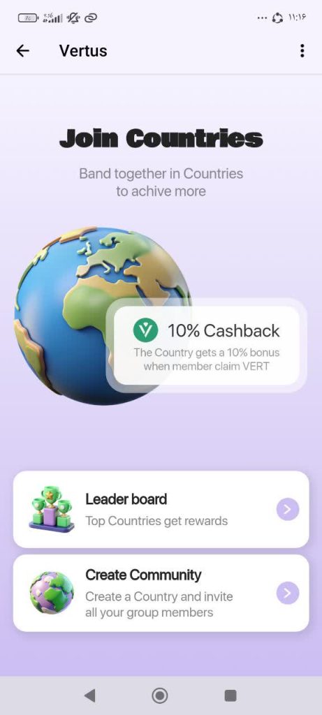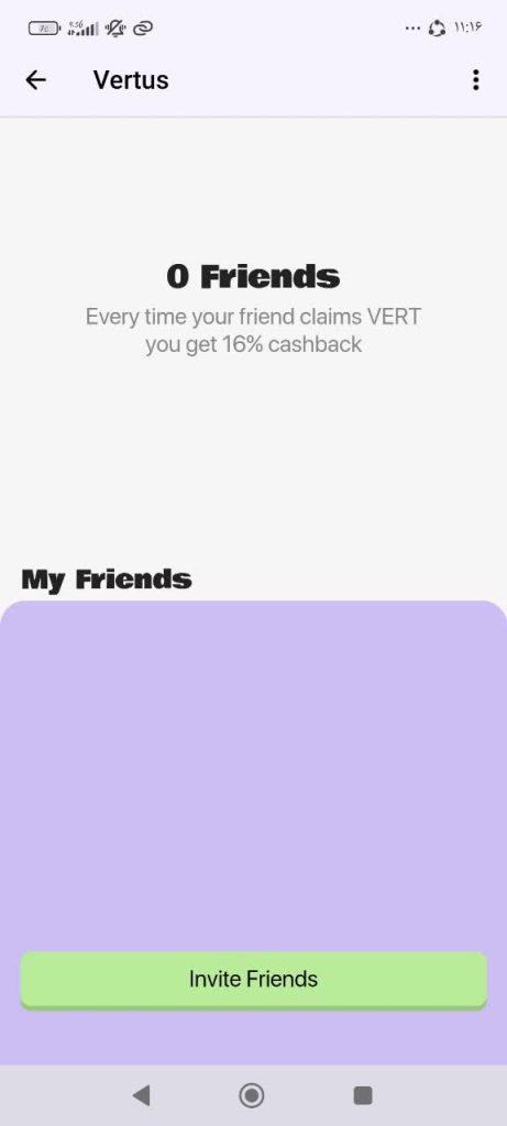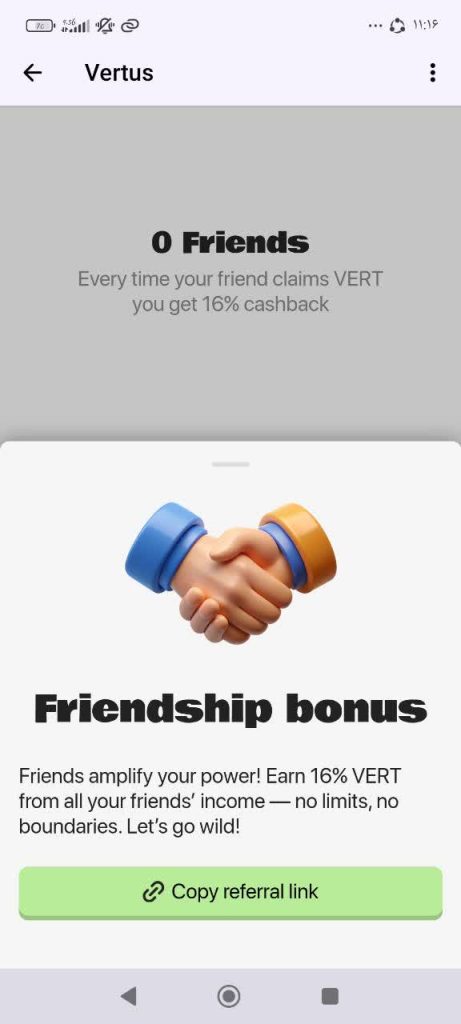 در این بخش شما با کپی لینک که برنامه بهتان می دهد می توانید دوستانتان را به زیر مجموعه خودتان اضافه کنید و بابت هر بار زدن دکمه claim ، به شما 16 درصد از VERT دریافتی دوستانتان به شما سود تعلق می گیرد.